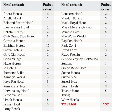 Antalya'da hangi otelde kaç futbol sahası var?
