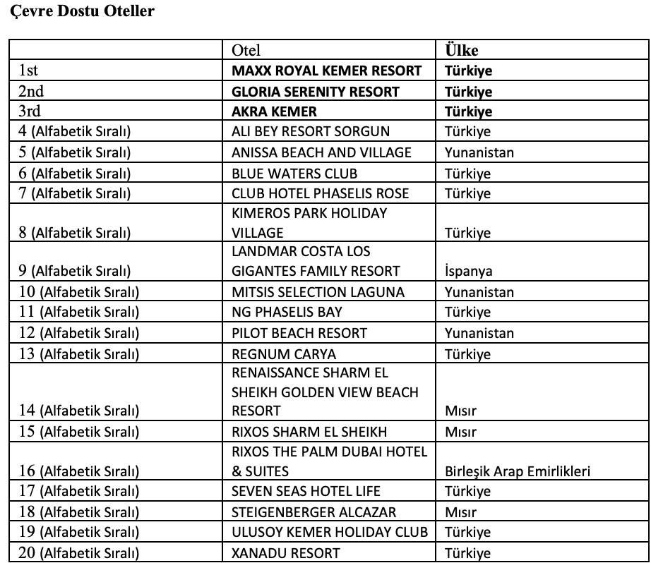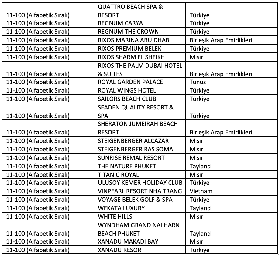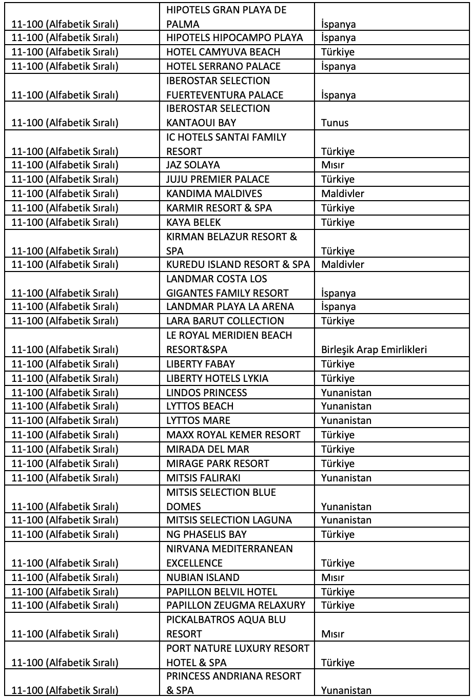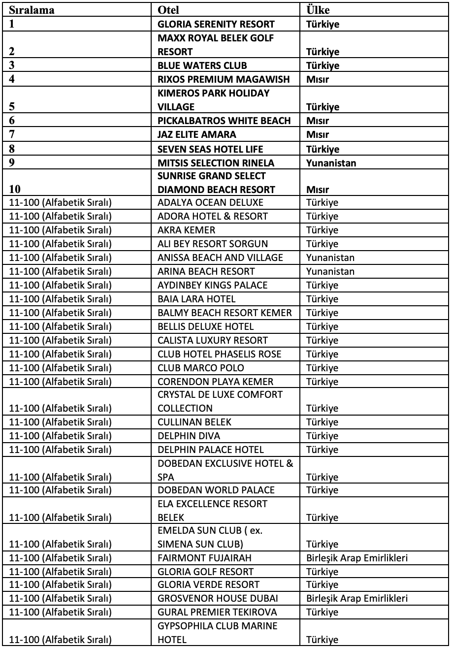 Top 100 World Best Hotels listesinde ilk üç sırayı Türkiye’den oteller aldı. Birincilik Gloria Serenity Resort’un olurken, ikinci sırada Maxx Royal Kemer Resort yer aldı. Üçüncülük ise Blue Waters Club’a verildi. İlk 100’e giren otellerin 56’sı Türkiye’den çıktı. Mısır 14, Yunanistan 10, İspanya ve Birleşik Arap Emirlikleri 6’şar otelle listede yer aldı.