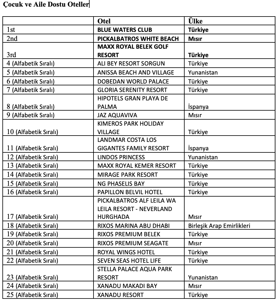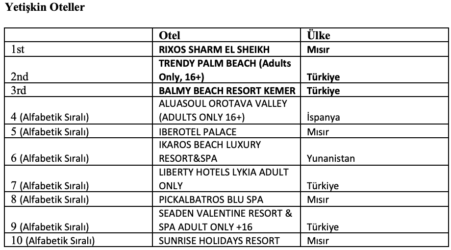 Çocuk ve aile konseptindeki otellerin değerlendirildiği kategoride ilk sırayı yine Blue Waters Club aldı. Çevre dostu uygulamaların öne çıktığı kategoride birincilik Maxx Royal Kemer Resort’un oldu. Bu yıl ilk kez verilen “Yetişkin Oteller” kategorisinde ise zirvede Rixos Sharm El Sheikh yer aldı.