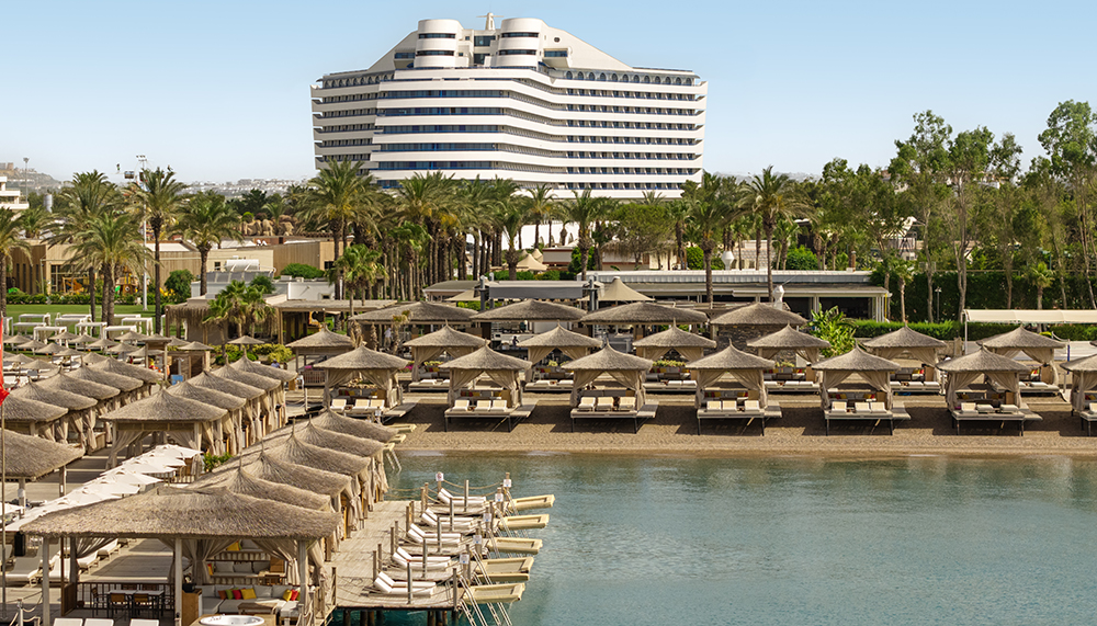 Titanic Mardan Palace ise mimarisiyle dikkat çeken bir diğer tesis. Oteldeki Mykonos Beach Club, dinlenme alanları ve kokteyl servisiyle misafirlere alternatif bir sahil deneyimi sunuyor.